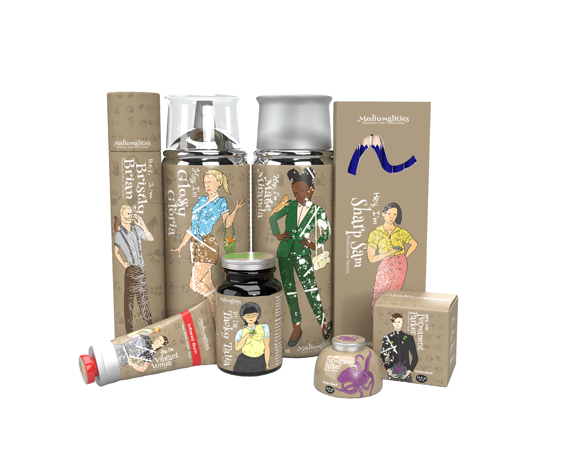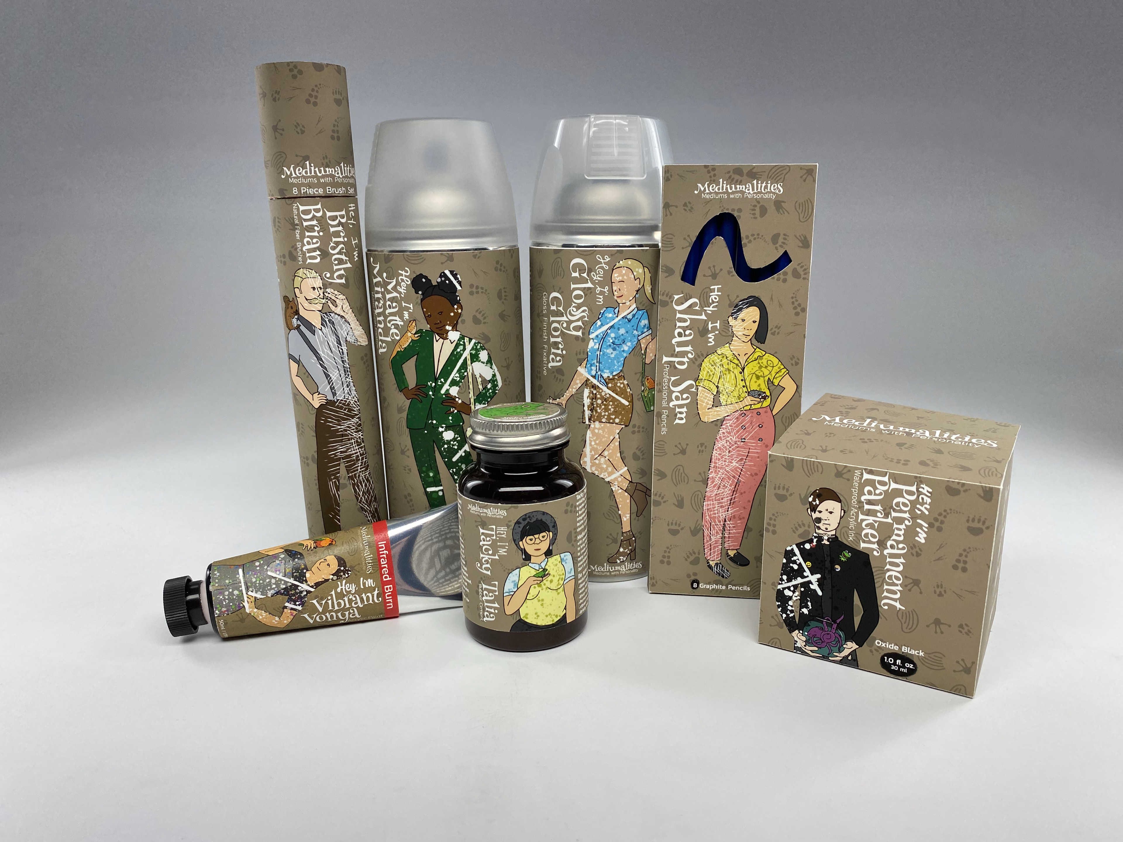 Mediumalities is an art supplies brand that was expanded to include an art store. Each art supply has a unique personality and pet related to the product. Don't be shy; say "hello!"